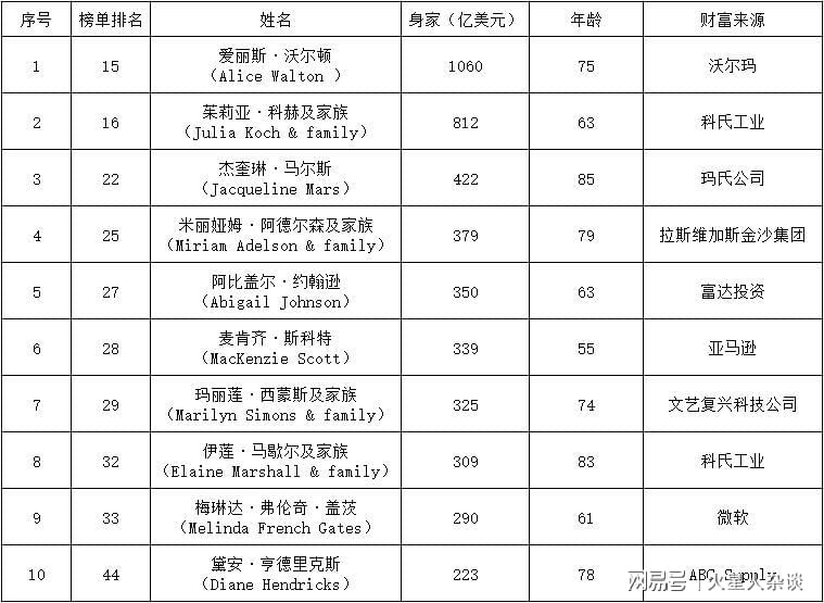 前九大女富豪的财富主要是继承而来的策略股,一是通过前夫或已故丈夫,例如麦肯齐·斯科特(创始人杰夫·贝索斯前妻)、梅琳达·弗兰奇·盖茨(微软创始人比尔·盖茨前妻)、米丽娅姆·阿德尔森(拉斯维加斯金沙集团创始人谢尔登·阿德尔森的遗孀)、玛丽莲·西蒙斯(“量化之王”詹姆斯·西蒙斯的遗孀)、伊莲·马歇尔(皮尔斯·马歇尔的遗孀)。