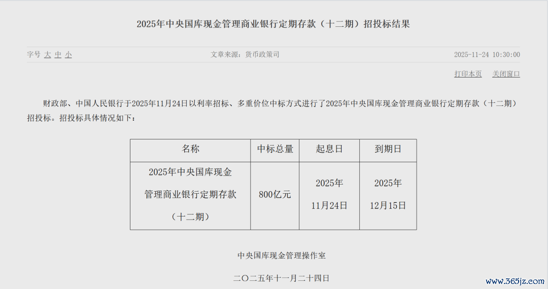 11月24日,央行官网公布2025年中央国库现金管理商业银行定期存款第十一期、第十二期招投标结果。