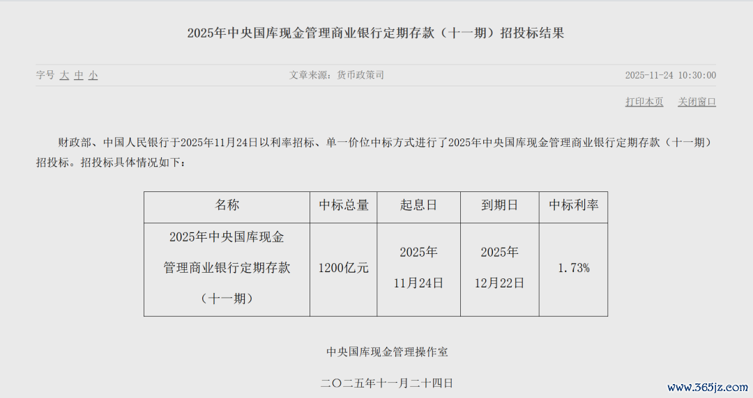 财政部、中国人民银行于2025年11月24日以利率招标、单一价位中标方式进行了2025年中央国库现金管理商业银行定期存款(十一期)招投标。该期中标总量为1200亿元;期限为1个月,起息日为2025年11月24日,到期日为2025年12月22日;中标利率为1.73%,较上次下降3个BP。