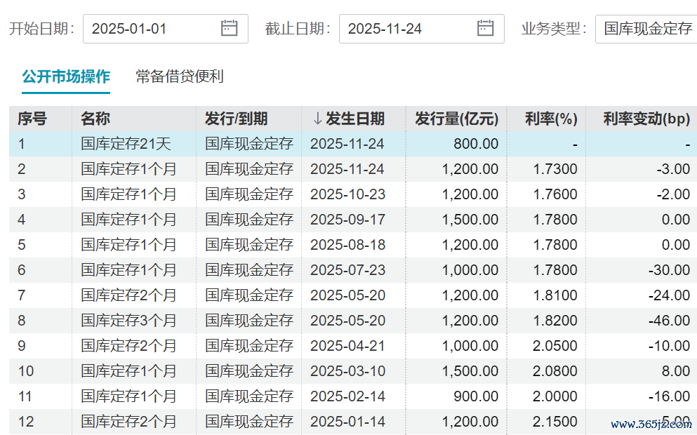 财政部、中国人民银行于2025年11月24日以利率招标、多重价位中标方式进行了2025年中央国库现金管理商业银行定期存款(十二期)招投标。该期中标总量为800亿元;期限为21天优配物料,起息日为2025年11月24日,到期日为2025年12月15日。